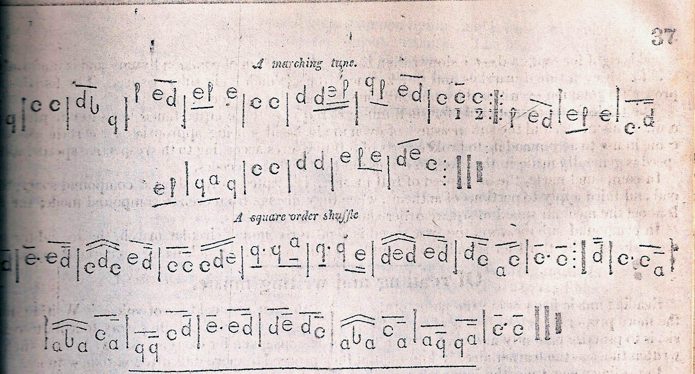 Top of the page: "A marching tune" from the Shaker book, A Short Abridgement of the Rules of Music, by Isaac N. Youngs, 1843