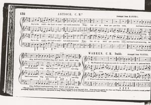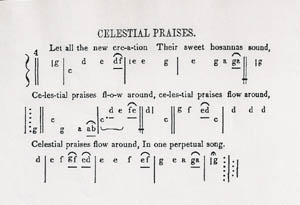 The above illustration shows "Celestial Praises" from 1841 in Shaker printed alphabet music notation,