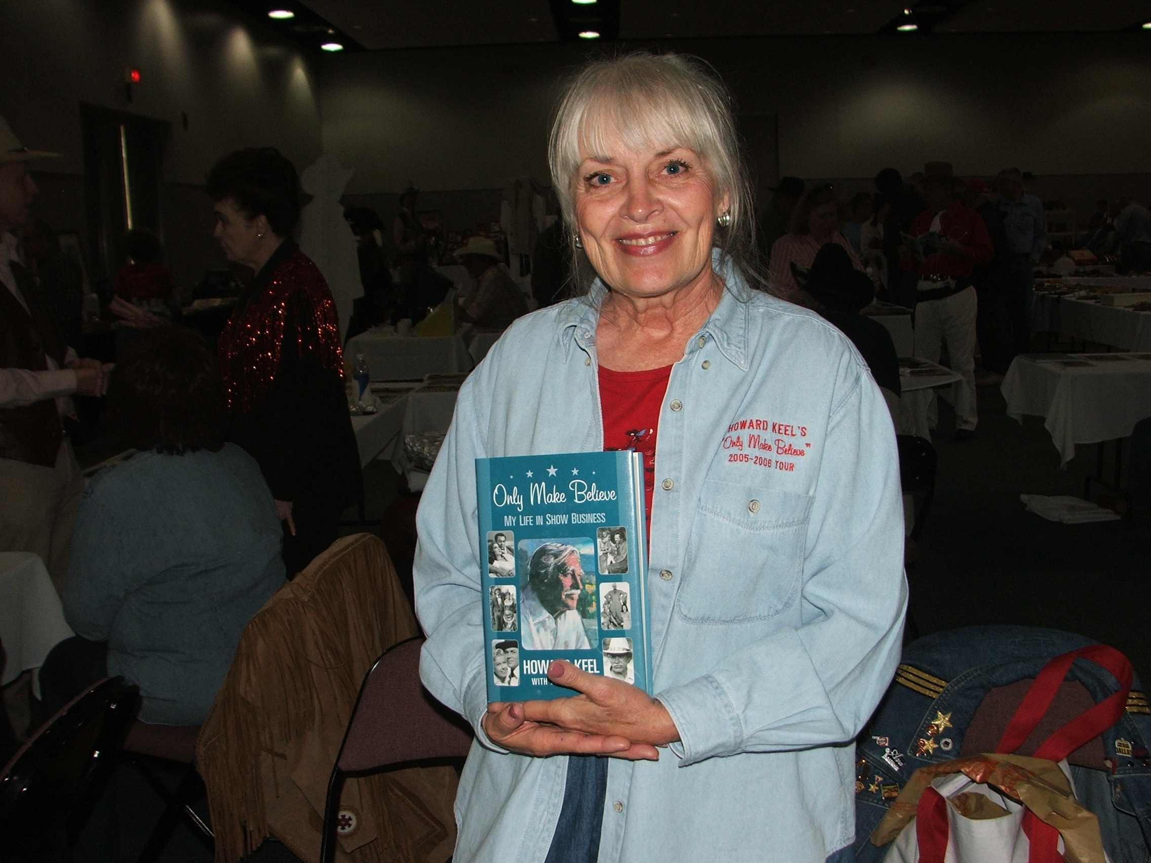 Judy Keel holding her late husband Howard Keel's book,