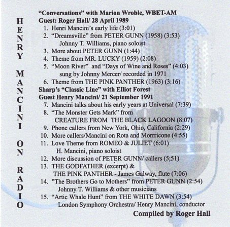 A special CD has been prepared that includes a special radio tribute from 1989 with some of Mancini's music from television and movies, plus a Public Radio program from 1991 with Henry Mancini answering questions from callers.