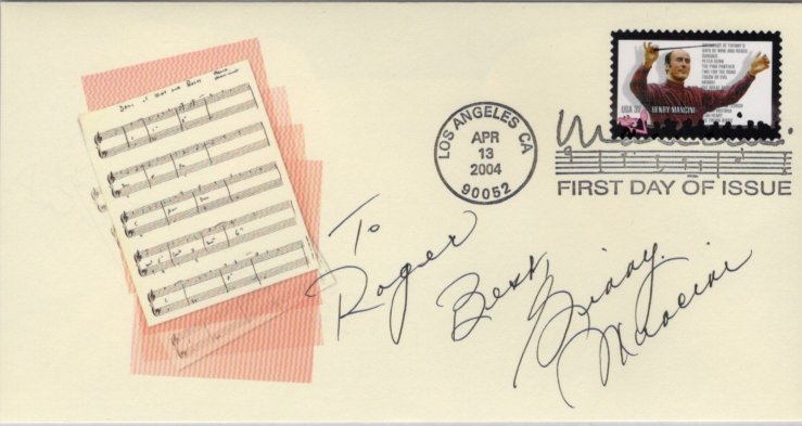 The US stamp campaign was led by Mancini's widow, Ginny Mancini, a former singer with Mel Torme and the Mel-Tones in the 1940s. She was kind to autograph and send me a special commemortive copy of that stamp: