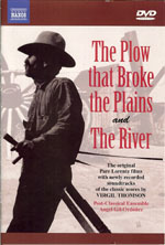 Thomson's film scores are excellent examples of making a great impact with a small ensemble. He also makes use of folk instruments, such as the banjo and guitar. Plus, he incorporates familiar tunes as well, including several popular songs such as "I Ride an Old Paint" and hymns like the "Doxology (Praise God from whom all blessings flow)" in THE PLOW, and "How Firm a Foundation" in THE RIVER. Thomson and also Pare Lorentz obviously felt strongly that using hymns prominently in both scores would make a strong impression with the audiences at that time.