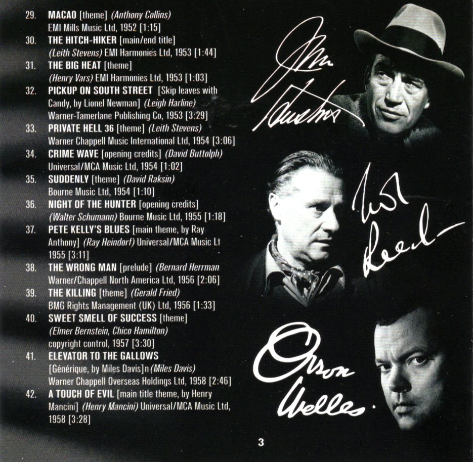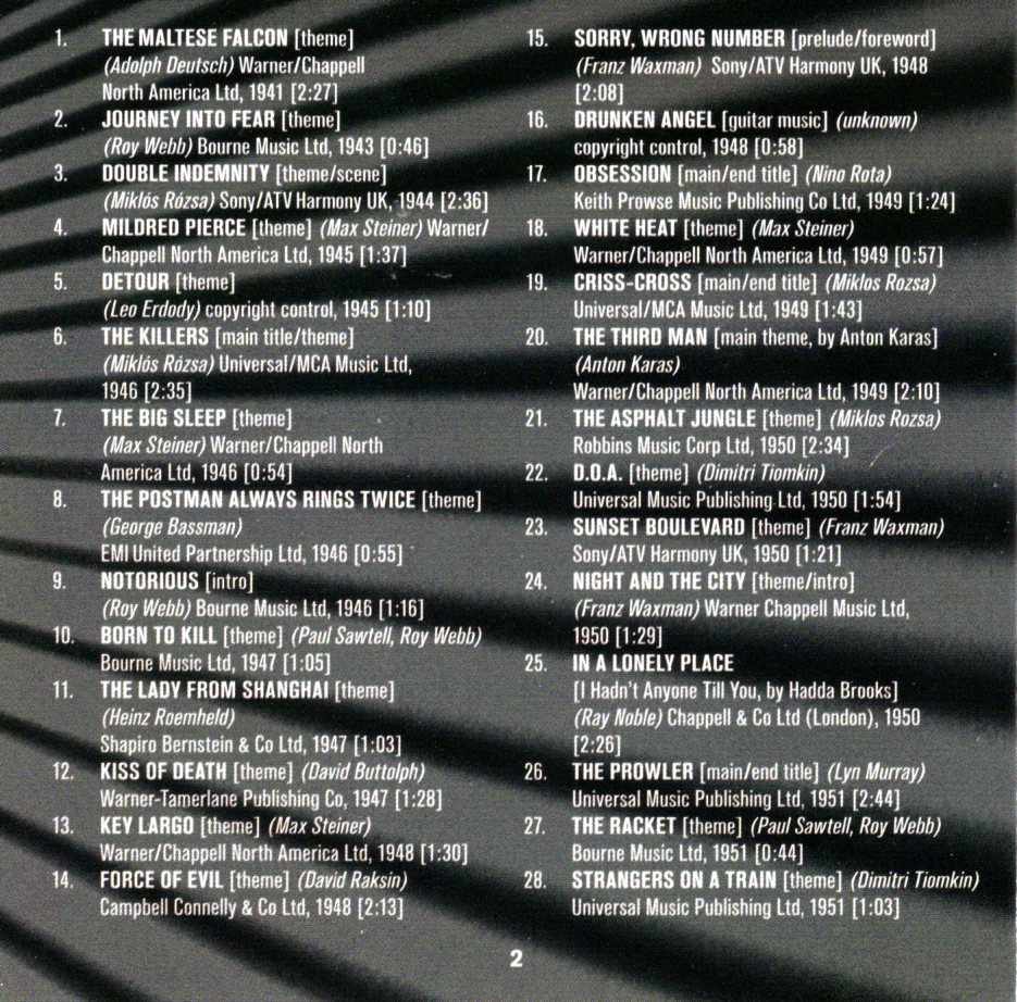 Just have a look at the list of the tracks below and you'll probably find at least one or maybe many favorite themes. Here are a few of the themes from film noir classics on this CD: