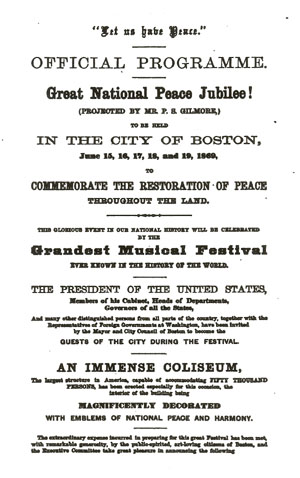 Four years after the end of the Civil War, a so-called "monster concert" was held in Boston. It was organized by Patrick Gilmore and officially called the Great National Peace Jubilee.