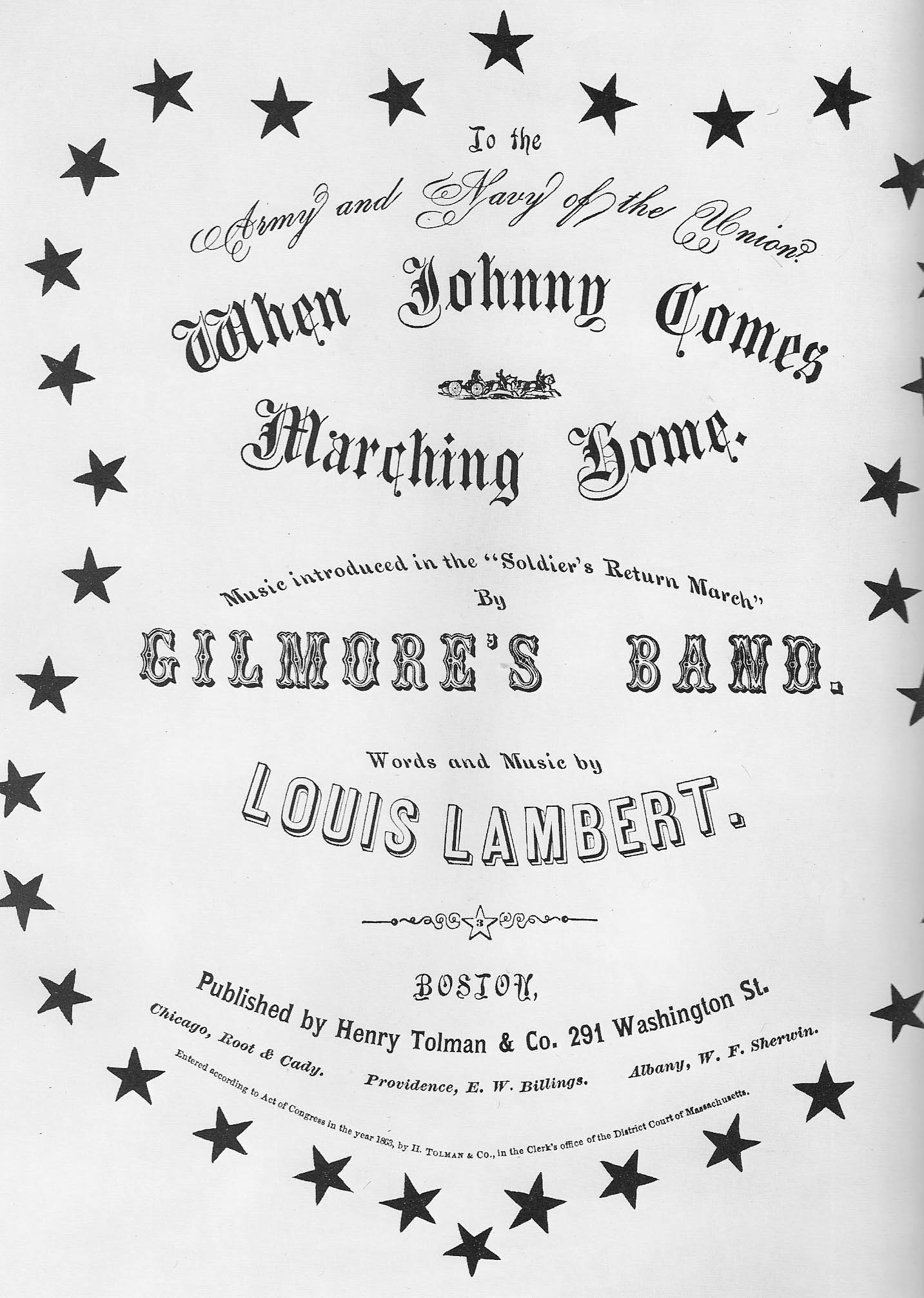 So it appears he did in fact write “When Johnny Comes Marching Home” and it was published in 1863 by Henry Tolman & Co., 291 Washington St, Boston.