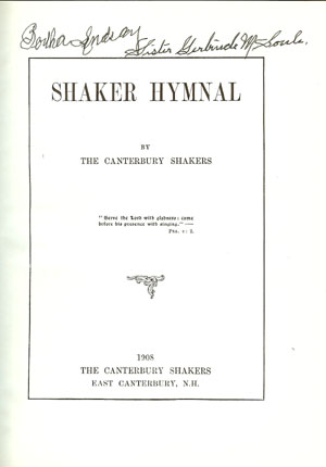Here is the Title Page with signatures of two departed Canterbury Shaker Sisters: Bertha Lindsay and Gertrude M. Soule, from a private collection:
